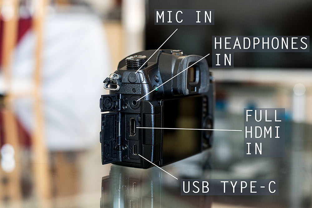 The stereo microphone inputs are now on the top of the camera just in front of the hotshoe as opposed to either side of it on the GH4. The sound recorded from these is pretty good but I never actually use them and I recommend that you don’t either…not for professional use anyway (ok for family stuff etc).