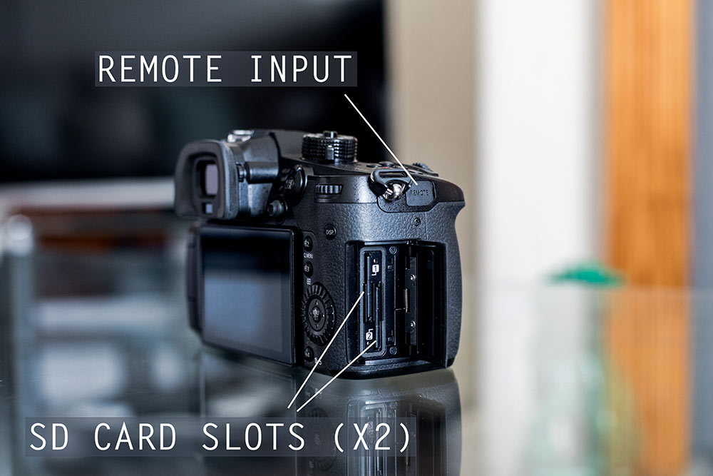 At the top of the right hand side is the remote connection (same as GH4) and below that is the flip out cover that houses the memory cards. Yes, the GH5 now has dual SD card slots which is fantastic. This means you can record simultaneously to both cards or use one for video and one for still and the cards are “hot swappable” which allows you to record indefinitely…